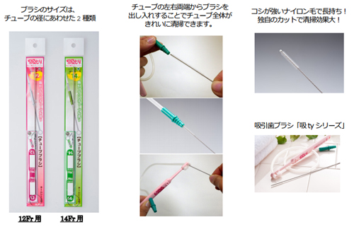 2003年より発売している吸引歯ブラシのチューブを洗う際には、水洗いや薬液に漬け置きを行うというものが主だった方法でしたが、このほど開発した『吸tyチューブブラシ』によって、チューブ内の汚れをかき出し、より一層チューブ内を清潔に保つことができるようになりました。また生産数の調整によりコストダウンを図り、テスト販売時よりも価格を抑え、ユーザーアンケートのご意見を反映させた300円台の価格を実現させました。