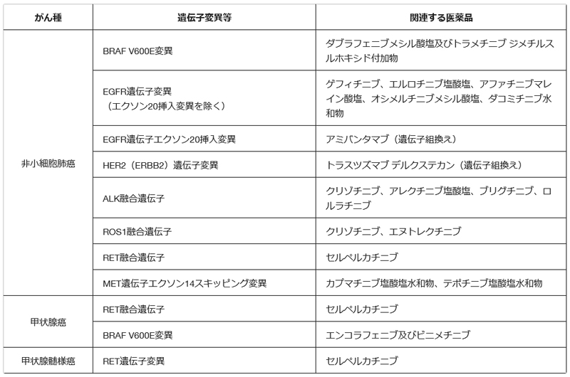 本品は、下表の医薬品の適応判定の補助を目的として、対応する遺伝子変異等を検出します。