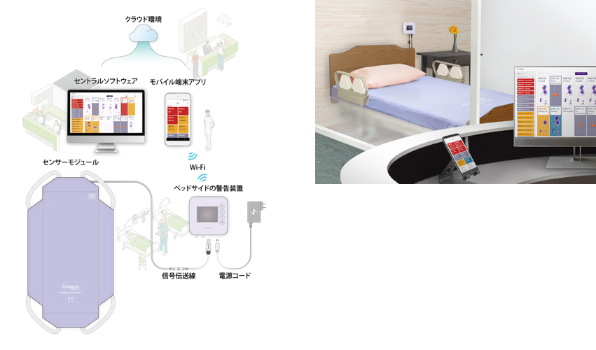 安全管理と褥瘡予測のトータルシステムです。非装着型センサーにより、24時間連続検知が可能です。独自の多段階の離床警告および感知技術を利用し、スタッフに迅速に離床を通知します。可視化された 体圧点の分布と組み合わせて体位変換をお知らせをします。また、心拍数や呼吸数もモニタリング可能です。