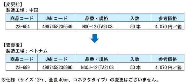 「ニプロ吸引カテーテル」 一部品番の製造工場、品番変更のご案内