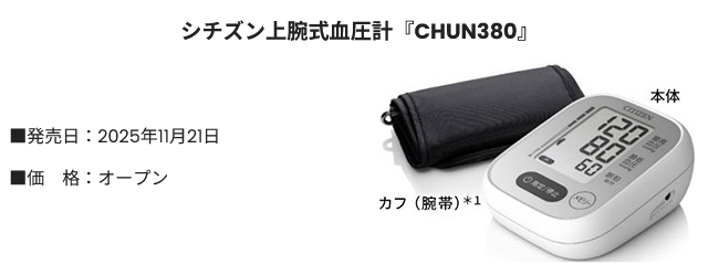 シチズン・システムズ株式会社(本社:東京都西東京市、社長:向島 克敏、以下当社)は、初期設定不要でかんたんに測定を開始でき、測定結果を確認しやすい大きな液晶画面を搭載したシチズン上腕式血圧計『CHUN380』を2025年11月21日に発売します。