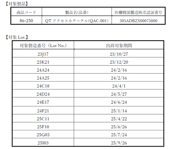 この度、弊社が製造販売しております人工開口向け単回使用内視鏡非能動処置具「QT アクセスカテーテル」(以下、「本品」といいます。)につきまして、下記対象ロットの自主回収措置を実施することといたしました。該当する製品のロットがございましたら、ご使用を停止していただき、ご購入いただきました卸様・販売会社様を通じて返品くださいますよう、お願い申し上げます。