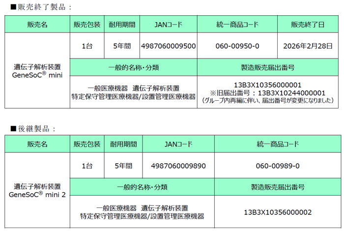 - 【杏林製薬株式会社】「遺伝子解析装置 GeneSoC® mini」販売終了のご案内 (2026-01-28)