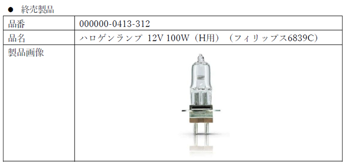 この度、下記の「ハロゲンランプ フィリップス 6839C」につきまして、供給元の生産終了により販売を終了いたします。当該品は、修理対応の終了した弊社の手術顕微鏡との互換性が担保された消耗品で、代替品はございません。