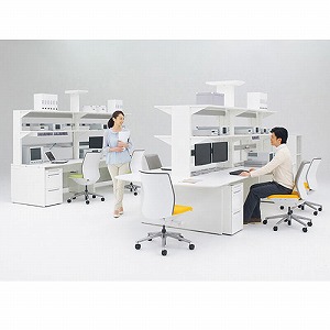 「ProUnit Freeway Labo」は、天板部分に当社オフィス製品のデスクシステムを採用した実験台です。充実した機能とともに、白を基調にしたデザイン性の高さが特徴です。