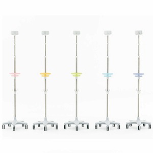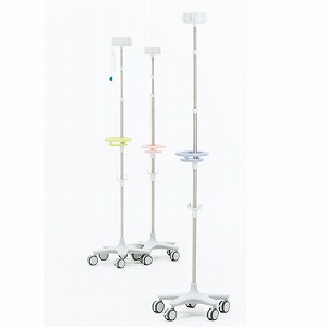 高い機能性とデザイン性を備えた「divo」は、看護師・患者の両者にとって使いやすいかたちを実現しています。輸液を掛けるフック部分を業界初のリング型にしたことで、従来より輸液を掛けやすく、扱いやすくなりました。ポール部分の上下操作は安全ストッパーを指で押し上げてロックを解除するだけで簡単に行うことができ、患者に最適な高さに調整することが可能です。ハンドルの部分はリング型で、介護者がサポートできるよう二人で握れるデザインになっており、患者がベッドから離れる際に小物置きとして使用したり、看護師が輸液を交換するときに一時的に輸液を置いたりすることができます。