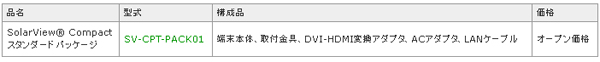 今回発売する「SolarView® Compact スタンダードパッケージ」は、太陽光発電を「見える化」する小型端末「SolarView® Compact (発売中)」に、液晶ディスプレイ壁掛金具(ハヤミ工産製)に対応した取付金具、DVI-HDMI変換アダプタ、ACアダプタ、LANケーブル(1.5m クロス)を同梱した大変お得なパッケージ商品です。 ロビーなどの壁面へ大型液晶ディスプレイを設置するケースで必要な部材がセットになっているので大変便利です。さらに、保証延長サービスの同時購入で、通常2年の保証期間が最長7年まで延長することができます。