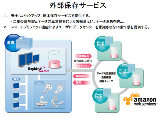 本サービスは、当社が提供するPACS(RapideyeCore™)の電子保存および運用管理技術と東芝が持つクラウド技術を組み合わせ、アマゾン ウェブ サービス®が提供するクラウドサービスを利用し、お客様へ安心・安全な新しいソリューションを提供します。