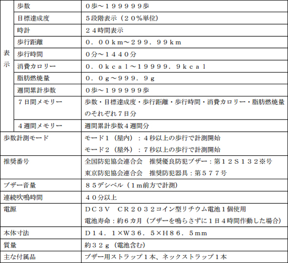 計測・表示項目は歩数、歩行距離、歩行時間、消費カロリー、脂肪燃焼量などで、メモリーはいずれも7日間。また、1日の目標歩数に対する達成度を5段階で視覚的に表示するほか、1週間の累計歩数とその達成度を4週間前まで表示します。