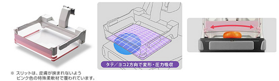 従来までの圧迫板では、乳房の最も厚みがある部分に集中して圧力が加わっていたため、その部分に強い痛みを感じることが多くありました。今回、当社が発売する「FS圧迫板」は、乳房と接触した際に圧迫板が乳房の厚みに沿って傾斜することに加え、圧迫板(ポリカーボネイト製)の前面部(胸壁(*3)部)と両側面部(左右)の計3か所に隙間(スリット)を設けることで、乳房を圧迫する際の圧力が面内で分散される設計になっています。当社は、マンモグラフィ検査時の痛みを軽減することを目指して(*4)、「FS圧迫板」を開発しました。