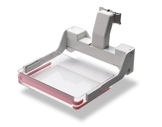 受診者の乳房を包み込むように密着し、しっかりと圧迫・固定が可能な新設計の圧迫板です。乳房を圧迫する際、まず胸壁を固定してから、胸壁から乳頭方向へ、また乳房の左右へゆっくりと圧迫していく設計になっており、しっかりと乳腺を伸ばしたポジショニングをサポートします。
