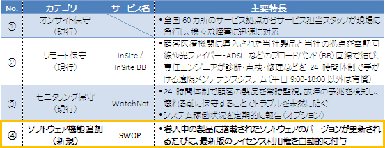新たに提供を開始する総合保守サービスは、現行の主要3サービス、(1)サービス担当スタッフによる現場でのオンサイト保守、(2)遠隔メンテナンスシステムよるリモート保守、(3)システム故障の予兆を監視するモニタリング保守に、(4)顧客医療機関が常に最新版のソフトウェアの機能を利用可能なソフトウェア機能追加サービス「SWOP(スウォップ)」(Software Obsolescence Protection)を加えたもの(詳細は下図参照)。