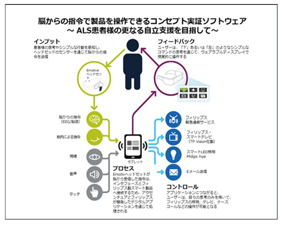 マサチューセッツ州アンドーバー、ニューヨーク - ロイヤル フィリップス(NYSE:PHG、AEX:PHIA、以下 フィリップス)とアクセンチュア(NYSE:ACN)は、本日、脳波を測定できるデバイス「Emotiv Insight Brainware」とウェアラブルディスプレイを接続したコンセプト実証ソフトウェア(以下 本ソフトウェア)を開発したことを発表しました。本ソフトウェアは、筋萎縮性側索硬化症(ALS)の患者様をはじめとした神経変性疾患患者様のより自立的な生活を支援する可能性のあるものです。年間40万人以上※1 が発症し、「ルー・ゲーリッグ病」※2 としても知られるALSは、脳と脊椎神経細胞を損傷させ、徐々に随意筋の働きを奪う難病です。末期の患者様の場合は、脳の機能は保持されたまま、全身麻痺の状態となることも多いとされています。