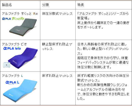 新発売の体圧分散式マットレス「アルファプラ すくっと Re」のほか、静止型ハイブリッドマットレス「アルファプラ ビオ」、床ずれ防止マットレス「アルファプラ L」、中国向けのマットレスなどを紹介します。また、元スピードスケート選手の清水宏保氏のトークショーと、理学療法士の下元佳子先生のセミナーを開催する予定です。