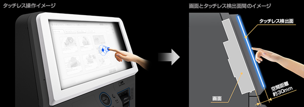 この度開発したフレームは、既存のパネルに取り付けることが可能です。従来のようにパネル上のボタン位置へ指を動かすと、フレームに内蔵された赤外線センサーにより、パネルから約30mm程度離れた位置でパネルに触れることなくボタン操作が出来ます。また、ボタン選択時の操作を音で知らせるアシスト機能により、初めて使用する人でも感覚的に操作でき、誤操作を防止します。